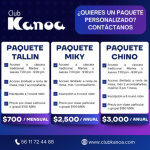 EVENTOS ¡Paquetes Mensuales y Anuales! ¡Invierte tiempo en lo que te hará bien este año! admin 1 año ago 1 min read Llegó el 2025 listo para que inicies con una nueva actividad. Tenemos 3 paquetes para ti. Puedes contactarnos a través de nuestras redes sociales Club Kanoa Tags: Clases Continue Reading Previous: ¡Renta tu mesa y ven a jugar!Next: Curso de árbitro de tenis de mesa Deja una respuesta Cancelar la respuestaTu dirección de correo electrónico no será publicada. Los campos obligatorios están marcados con *Comentario * Nombre * Correo electrónico * Web Guarda mi nombre, correo electrónico y web en este navegador para la próxima vez que comente. Related Stories Resultados Varonil EVENTOS Resultados Varonil admin 1 mes ago Resultados -1100 puntos EVENTOS Resultados -1100 puntos admin 1 mes ago Resultados Universitarios EVENTOS Resultados Universitarios admin 1 mes ago Resultado Sub-11 EVENTOS Resultado Sub-11 admin 1 mes ago Resultado Sub 15 EVENTOS Resultado Sub 15 admin 1 mes ago Grupos -1700 EVENTOS Grupos -1700 admin 4 meses ago