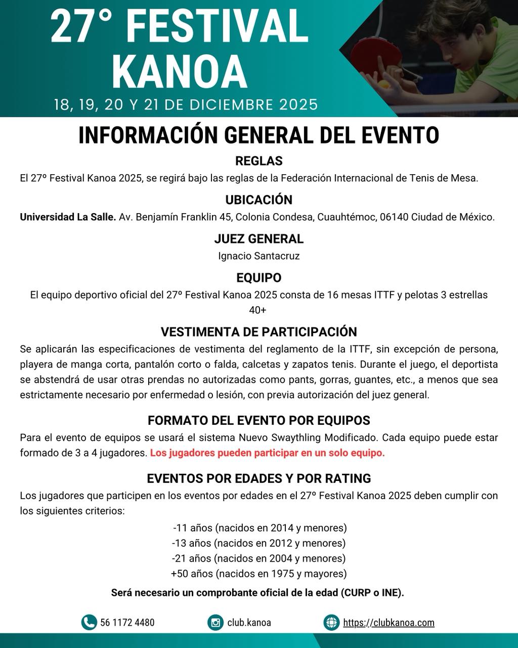 EVENTOS Información General del Evento admin 5 meses ago Tags: festivalkanoa pingpong tenisdemesa Continue Reading Previous: Fotos Sub 21Next: Registro Festival Kanoa 2026 Deja una respuesta Cancelar la respuestaTu dirección de correo electrónico no será publicada. Los campos obligatorios están marcados con *Comentario * Nombre * Correo electrónico * Web Guarda mi nombre, correo electrónico y web en este navegador para la próxima vez que comente. Related Stories Resultados Varonil EVENTOS Resultados Varonil admin 1 mes ago Resultados -1100 puntos EVENTOS Resultados -1100 puntos admin 1 mes ago Resultados Universitarios EVENTOS Resultados Universitarios admin 1 mes ago Resultado Sub-11 EVENTOS Resultado Sub-11 admin 1 mes ago Resultado Sub 15 EVENTOS Resultado Sub 15 admin 1 mes ago Grupos -1700 EVENTOS Grupos -1700 admin 4 meses ago